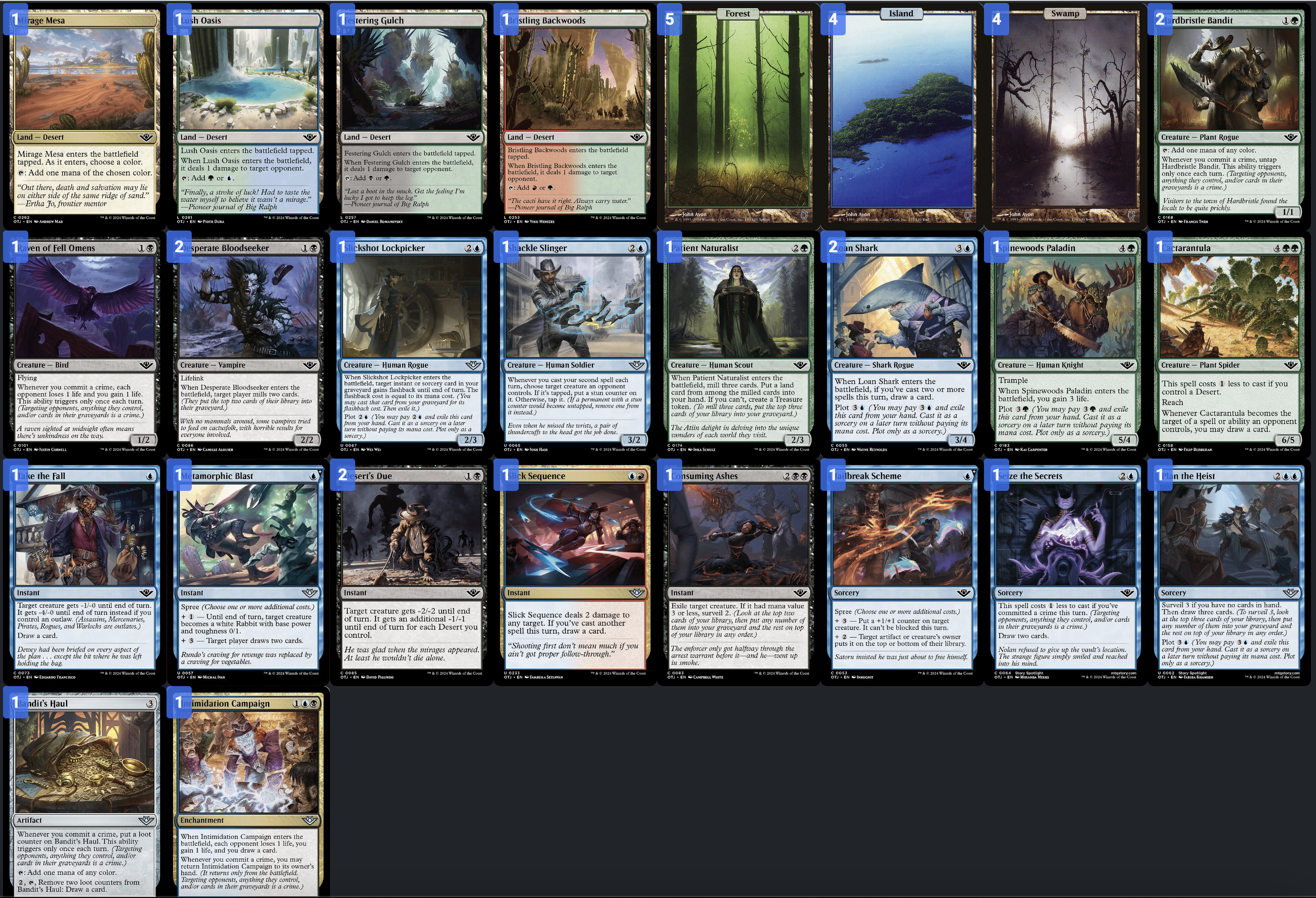 OTJ spoilers are almost fully up, and it's looking like it might be a banger! It's a Dave Humpherys set, of course, with one of the classic properties that make his sets so fun: common dual lands! And just like the snow lands in KHM, these even play into one of the set's mechanics: crime.