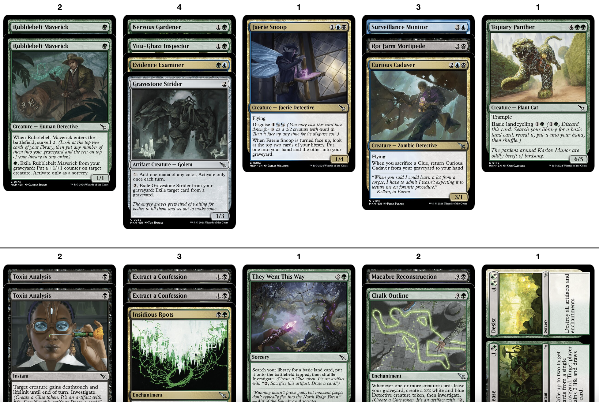 Insidious Roots and Chalk Outline are some of the strongest cards in the set. If you can trigger them multiple times, they give quite the insane output - at 3 times, Roots represents a 1/2, 2/3, and 3/4 for 2 mana; and Chalk represents three 2/2s and three clues for 4 mana.Of course, it's not quite that simple, as triggering them certainly isn't trivial. 2 or 4 mana spent on an enchantment that does nothing will lose you the game. So how do you make the juice worth the squeeze?