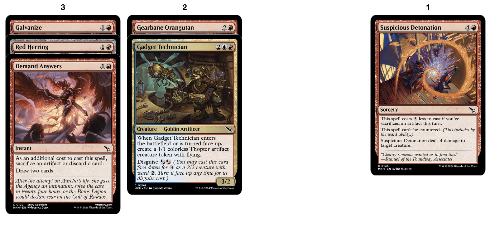 Shock and Galvanize. And there's plenty of support for various archetypes - Goblin Maskmaker and big disguise creatures for the Gruul disguise deck; and Person of Interest for the go-wide Boros deck. But it just feels like the synergy doesn't quite come out at common much.The biggest thing I can point to is a focus on clues and sacrificing artifacts in general - all the cards pulled out above deal with artifacts in some way, and this ties into more specific synergy support at uncommon, like with