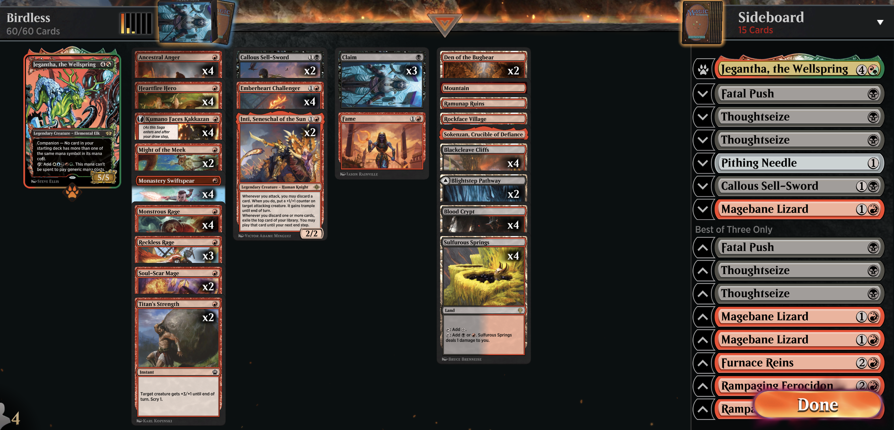Sidenote: there are many many many other iterations that we on Sanctum went through in exploring the red aggro space, including various levels of unhinged builds from Boros Mice to Rakdos Midrange With Flings. I've picked out the ones I most remember, and ones that seem most pertinent to our final build; but there were many many more besides.