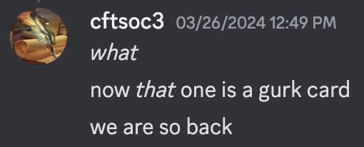 This PT was a really interesting confluence of a lot of factors for me. cftsoc and I had been working on Slogurk for most of a year, so we went in before the spoiler already primed to gurk. And as soon as the spoiler dropped, and we knew the deck was busted.